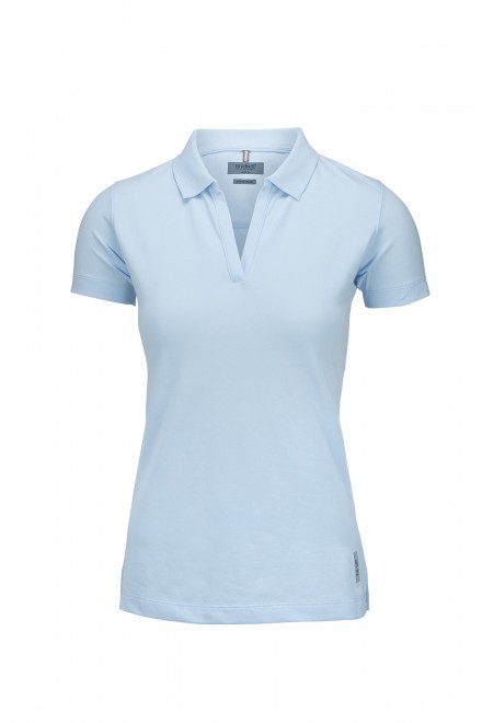 Polo shirt voorzien van een rekbare pasvorm, V-hals zonder knoopsluiting, getailleerd damesmodel